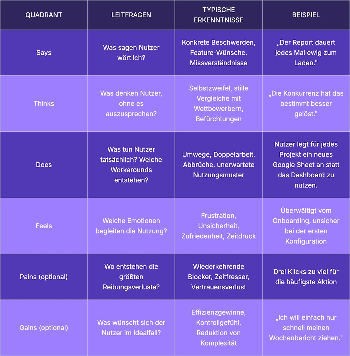 Die Empathy Map teilt die Nutzerperspektive in vier Quadranten: Says (was Nutzer sagen), Thinks (was sie denken), Does (was sie tun) und Feels (was sie fĂŒhlen). Jeder Teilnehmer fĂŒllt die Quadranten zunĂ€chst individuell aus, bevor das Team gemeinsam clustert und priorisiert. Optional lassen sich die Bereiche Pains und Gains ergĂ€nzen, um Schmerzpunkte und WĂŒnsche explizit zu erfassen.