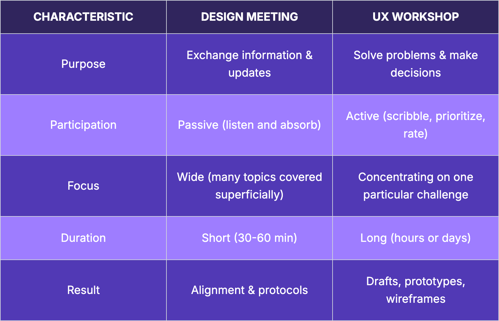The key difference lies in the mindset: meetings are often passive and serve to exchange information. How often have you entered a meeting knowing that you won't say a word?