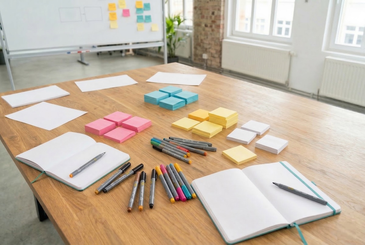 Good workshops start days before the actual date. In addition to defining a clear goal and a precise "how-might-we" question, providing context is crucial. Share existing research results or personas with the team in advance so that all participants start with the same level of knowledge. Whether on site with whiteboards and markers or remotely with tools such as Miro or Mural - the setup must function smoothly so as not to disrupt the creative focus.