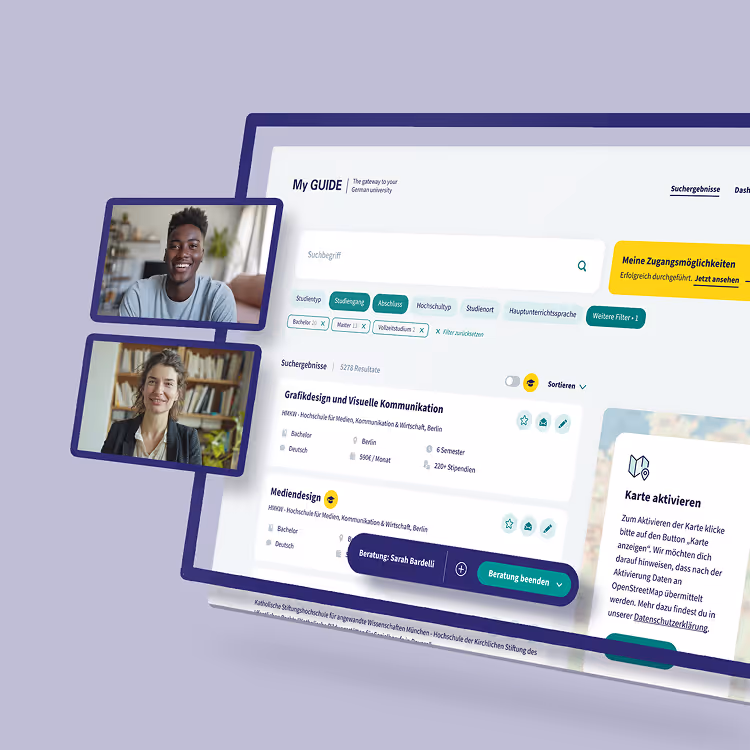 Der Deutsche Akademische Austauschdienst (DAAD) hat mehr als 60 Büros auf der ganzen Welt, die internationalen Studierenden dabei helfen, sich rund ums Studium in Deuschland zu orientieren. Wir haben eine in My GUIDE integrierte Beratungsplattform entwickelt, um diese Berater in ihren unterschiedlichen Einsatzgebieten zu unterstützen und eine einheitliche Nutzererfahrung zu schaffen, die persönliche Beratungsgespräche, Videoanrufe und E-Mail-Austausch miteinander verbindet.